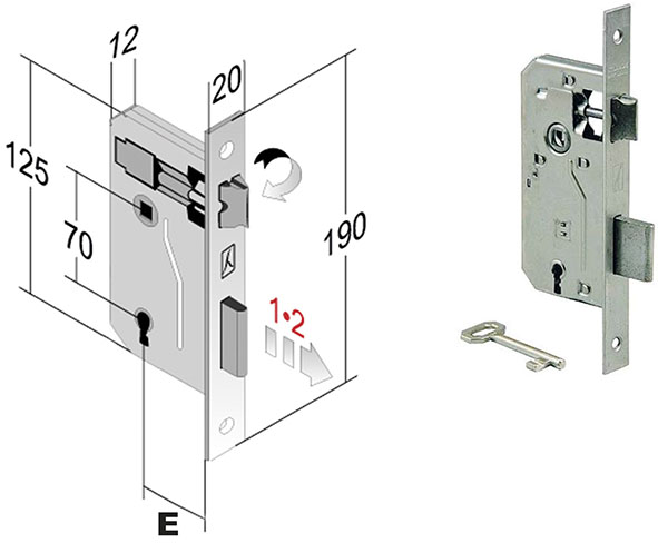 Serrature da infilare bordo QUADRO. In acciaio lucido. 2 mandate e scrocco reversibile. Interasse mm.70. Quadro maniglia mm.8. In dotazione 1 chiave.