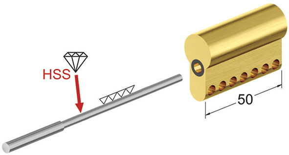 Kit composto da alberino con attacco d.mm.6,3 per la fresa a tazza e finto cilindro guida alberino. Sostituendo alla punta guida della fresa a tazza con l'alberino in dotazione permette di centrare facilmente e con precisione il foro per l'inserimento della protezione cilindro.