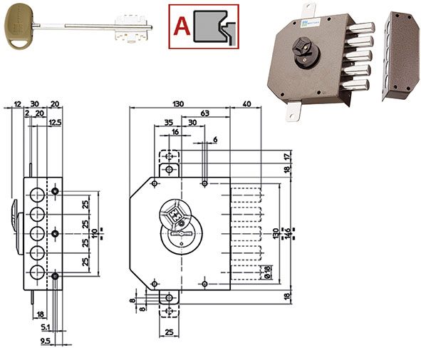 Serratura doppia mappa ANTIDECODUE da applicare verniciata. Triplice con 5 catenacci. Entrata 63. 4 mandate. Corsa catenacci mm.40. Apertura interna ed esterna con chiave. Con 3 chiavi (92106/4). Senza aste (93140). Figura mano Dx.