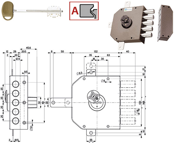 Serratura doppia mappa ANTIDECODUE da applicare verniciata. Quintuplice con 5 catenacci. Entrata 63. 4 mandate. Corsa catenacci mm.40. Apertura interna ed esterna con chiave. Con 3 chiavi (92106/4). Senza aste (93141) e deviatore (96143) da ordinare a parte. Figura mano Dx.