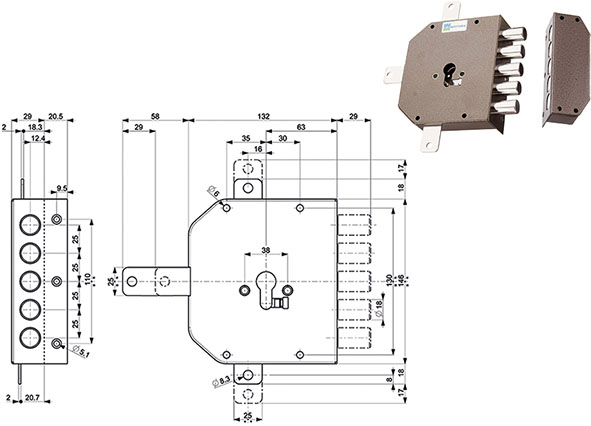 Serratura per cilindro europeo, da applicare verniciata. Quintuplice 5 catenacci. Entrata 63. Corsa catenacci mm.30. Apertura interna ed esterna con cilindro non in dotazione, da ordinare a parte. Senza aste 93141 e deviatore 96145 da ordinare a parte. Figura mano Dx.