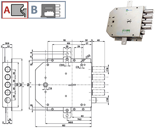 Serratura applicare triplice per porte blindate. Doppia mappa ANTIDECODUE. 4 catenacci e scrocco. Entrata chiave mm.63. Catenacci rinforzati con corsa mm.40 sporgenza 3mm. 4 mandate. Quadro laterale mm.8 entrata mm.150. Corsa aste mm.17. Con 3 chiavi mm.40 (92187) testa kaki. Gorges ricambio 91184/106.
