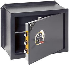 Da incasso. Chiusura con chiave. Certificate secondo norma UNI EN 14450, grado S2, da ICIM. Serratura doppia mappa ANTIDECODUE. Chiavistelli sagomati mm.24x20. Protezione al manganese estesa ai chiavistelli frontali. In dotazione 1 ripiano e 2 chiavi 92297/5. Spessore sportello mm.10. Spessore cornice mm.12.