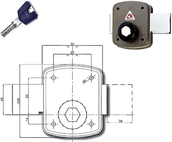 Serratura laterale da applicare verniciata. Entrata 30. Corsa catenaccio mm.38. Apertura interna con pomolo. Esterno cilindro K55 L mm.50 d.29. In dotazione 3 chiavi (ns.cod.847367), ferrogliera, bocchetta e viti.