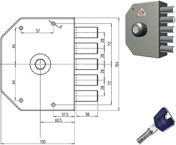 Serratura da applicare verniciata. Laterale con 5 catenacci. Entrata 60. Corsa catenaccio mm.38. Apertura interna con pomolo. Esterno cilindro K55 mm.50 d.29. In dotazione 3 chiavi (ns.cod.847367), ferrogliera, bocchetta e viti.