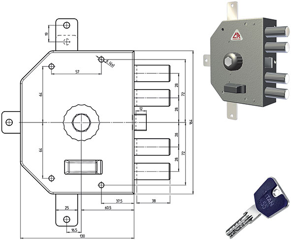Serratura da applicare verniciata. Quintuplice con 4 catenacci e scrocco. Entrata 60. Corsa catenaccio mm.38. Apertura interna con pomolo. Esterno cilindro K55 mm.50 d.29. In dotazione 3 chiavi (ns.cod.847367), ferrogliera, scatola derivazione, bocchetta e viti. Senza aste (ns.cod. da 847350 a 847352) e aste derivazione (ns.cod 847353).