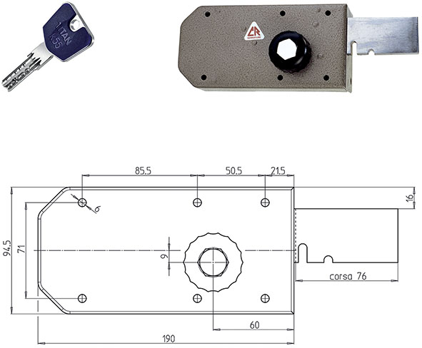 Serratura laterale da applicare verniciata. Entrata 60. Corsa catenaccio mm.76. Apertura interna con pomolo. Esterno cilindro K55 L mm.50 d.29. In dotazione 3 chiavi (ns.cod.847367), ferrogliera, bocchetta e viti.