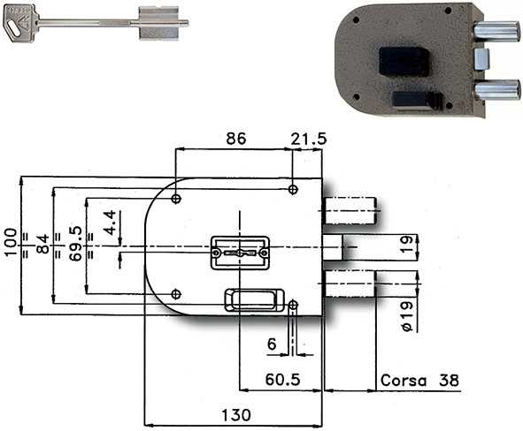 Serratura doppia mappa da applicare verniciata. Laterale con 2 catenacci e scrocco. Entrata 60. Corsa catenaccio mm.38. In dotazione 3 chiavi (ns.cod.882414 oppure 847370), ferrogliera, bocchetta e viti.