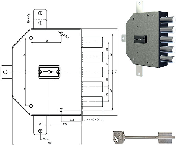 Serratura doppia mappa da applicare verniciata. Con dispositivo NO ENTRY. Quintuplice con 5 catenacci. Entrata 60. Corsa catenaccio mm.38. In dotazione 3 chiavi (ns.cod.882414 oppure 847370), ferrogliera, scatola derivazione, bocchetta e viti. Senza aste (ns.cod. da 847350 a 847352) e aste derivazione (ns.cod.847353).