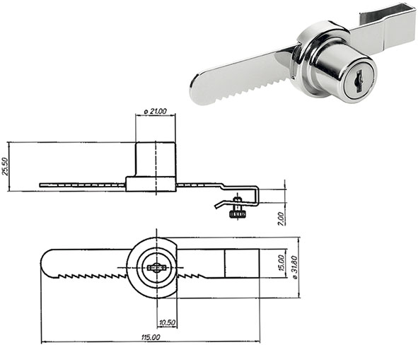 Serratura cromata per cristalli scorrevoli fino a mm.7 di spessore. Cilindro d.mm.21. Rotazione 180? (2 uscite chiave). 2 chiavi in dotazione. (Chiave ricambio Silca MR34R).