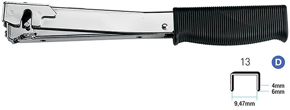 Fissatrice manuale a martello, piccola e leggera, con presa ad una mano e impugnatura rivestita in gomma anti-scivolo. Interamente in acciaio nichelato. Ideale per pannelli a parete e affissione di etichette su casse, poster e per soffittature. Peso Kg.0,40. Utilizza punti metallici M13/6 (ns.cod.310573).